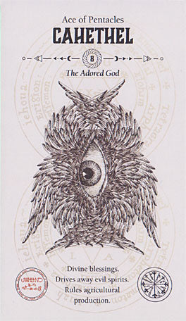 Based on the Shem HaMephorash angelic theories of Cornelius Agrippa, this deck can be used for summoning said entities, for which the book contains instructions, or for divination or meditation. Each card features the name of an angel, a pen and ink drawing of it, its major power, meaning of its name, and Solomonic seals and glyphs.